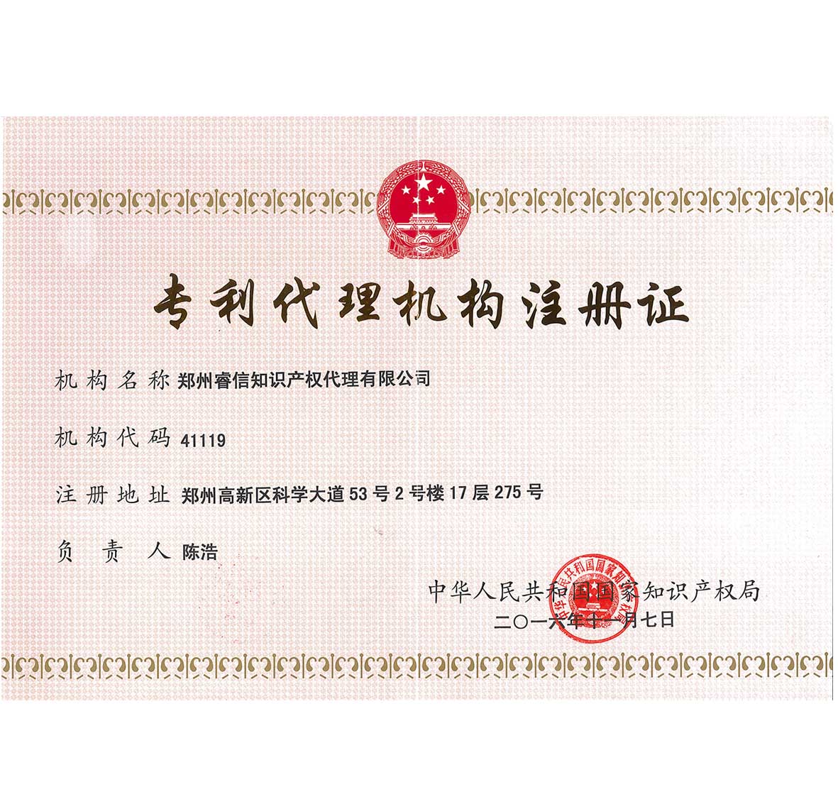 公司陳浩總經(jīng)理被評(píng)為“2016年度五星級(jí)專(zhuān)利代理人”。