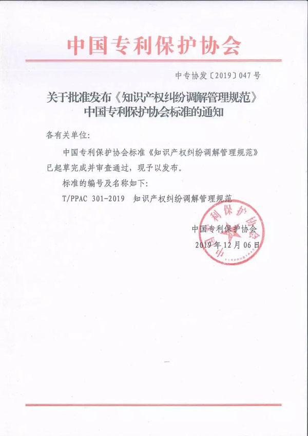 關于批準發(fā)布《知識產權糾紛調解管理規(guī)范》中國專利保護協(xié)會標準的通知